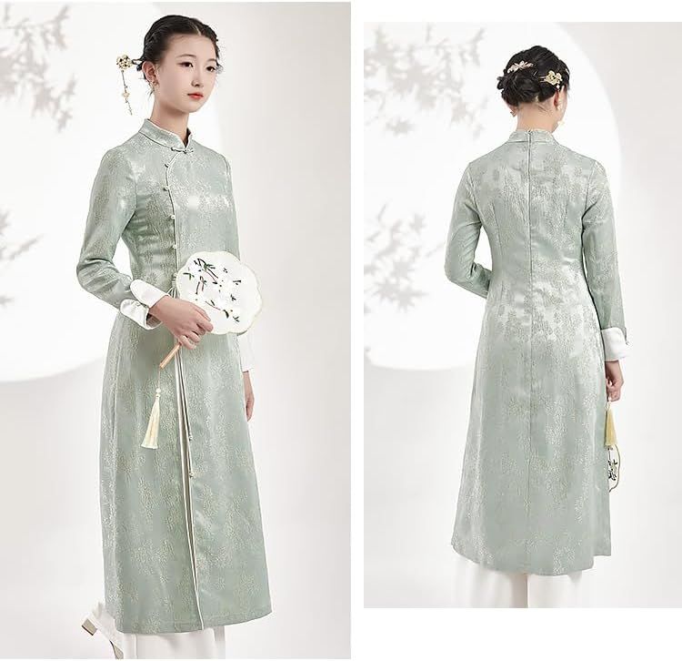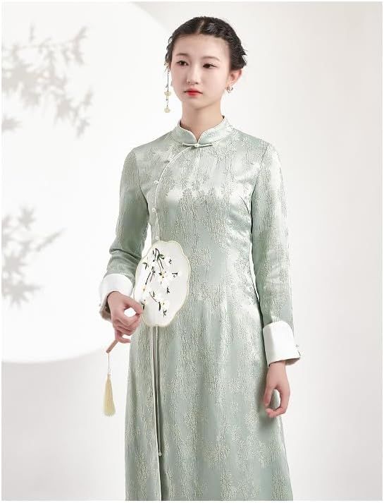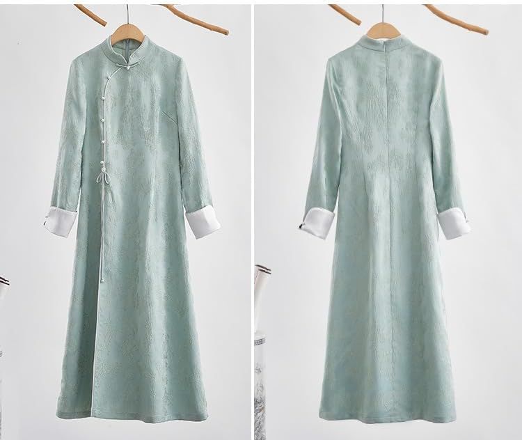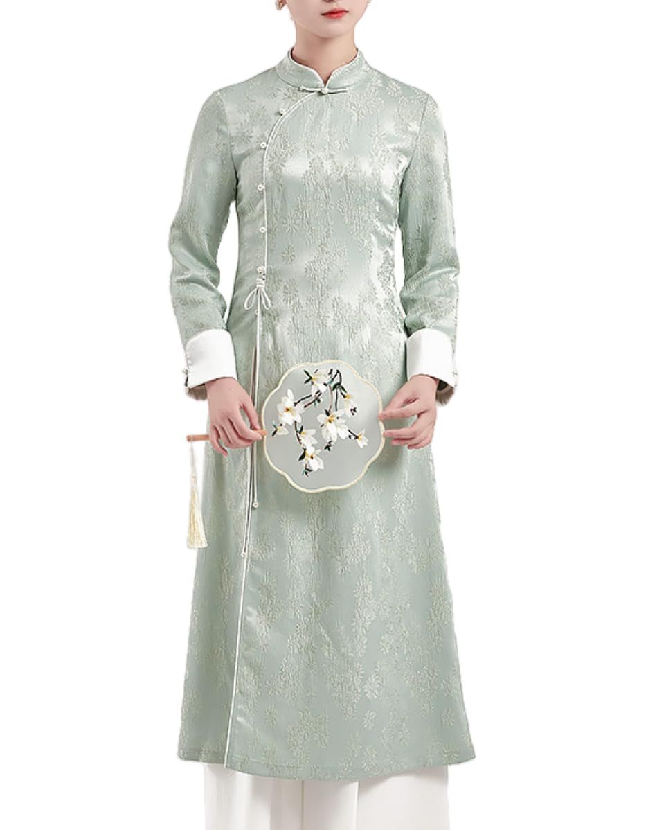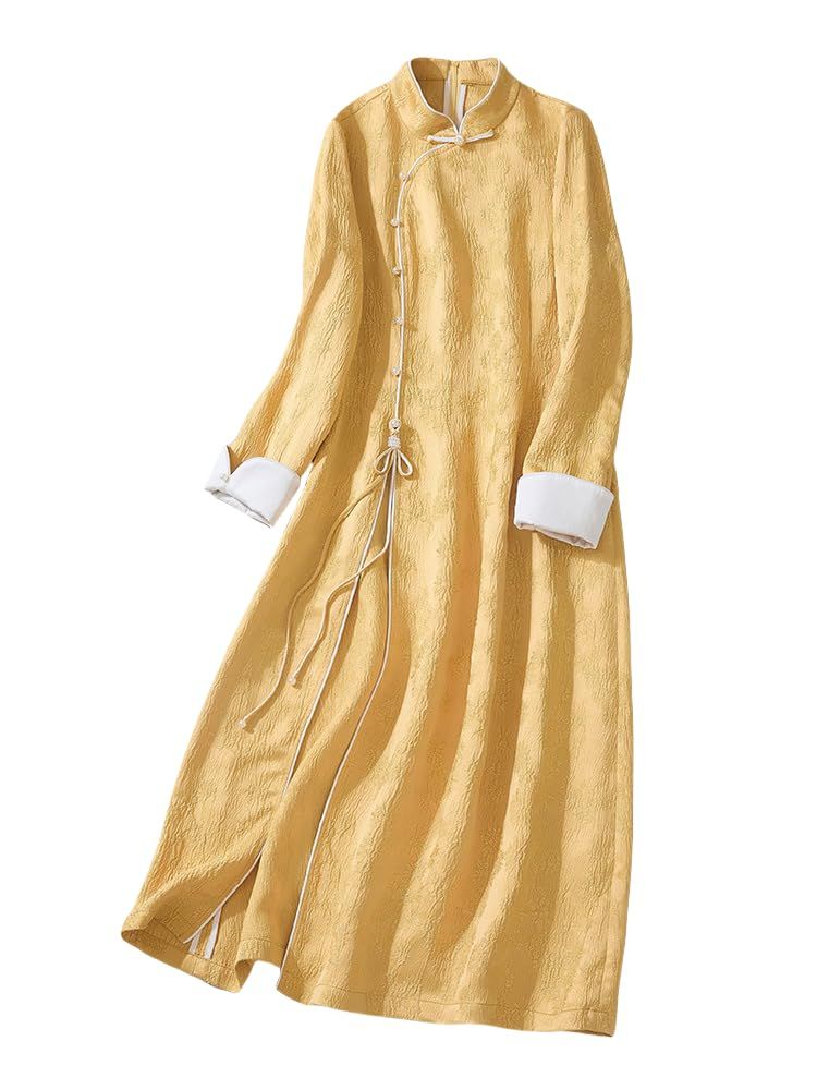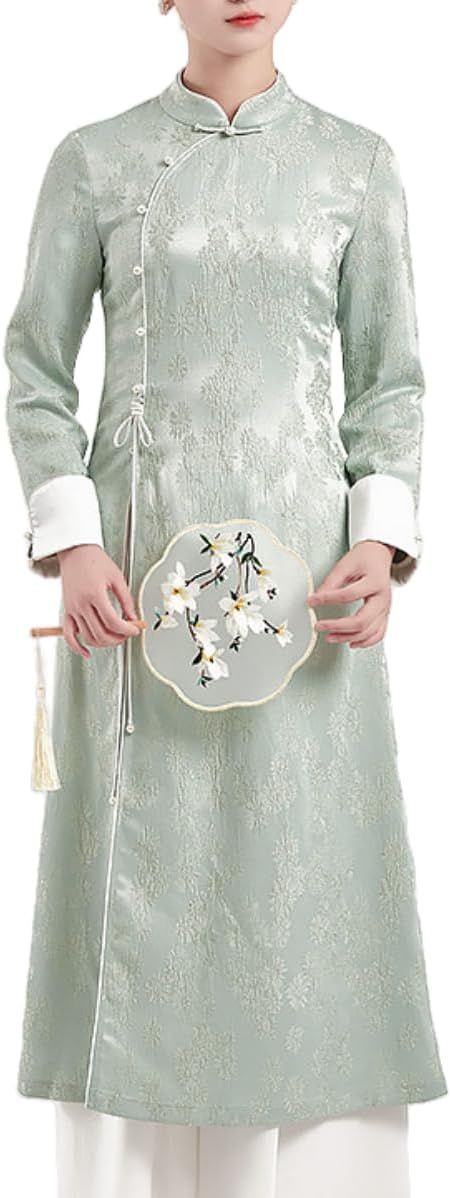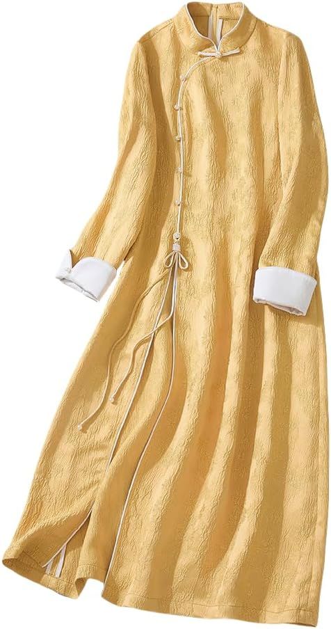 Irsutey Women's Solid Color Chinese Standing Collar Front Slit Hanfu Long Sleeved Buckle Daily Dress