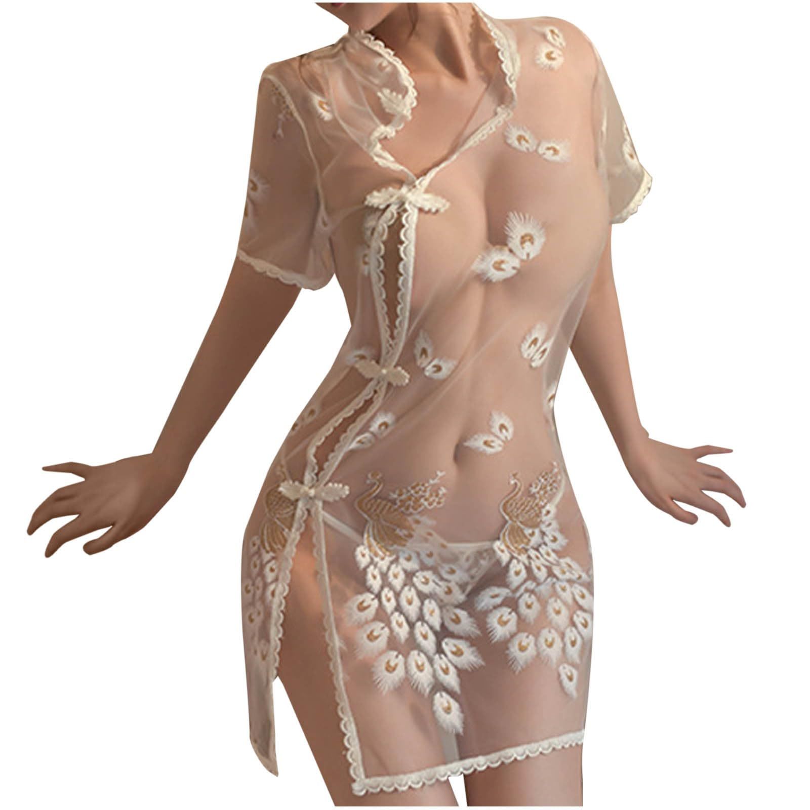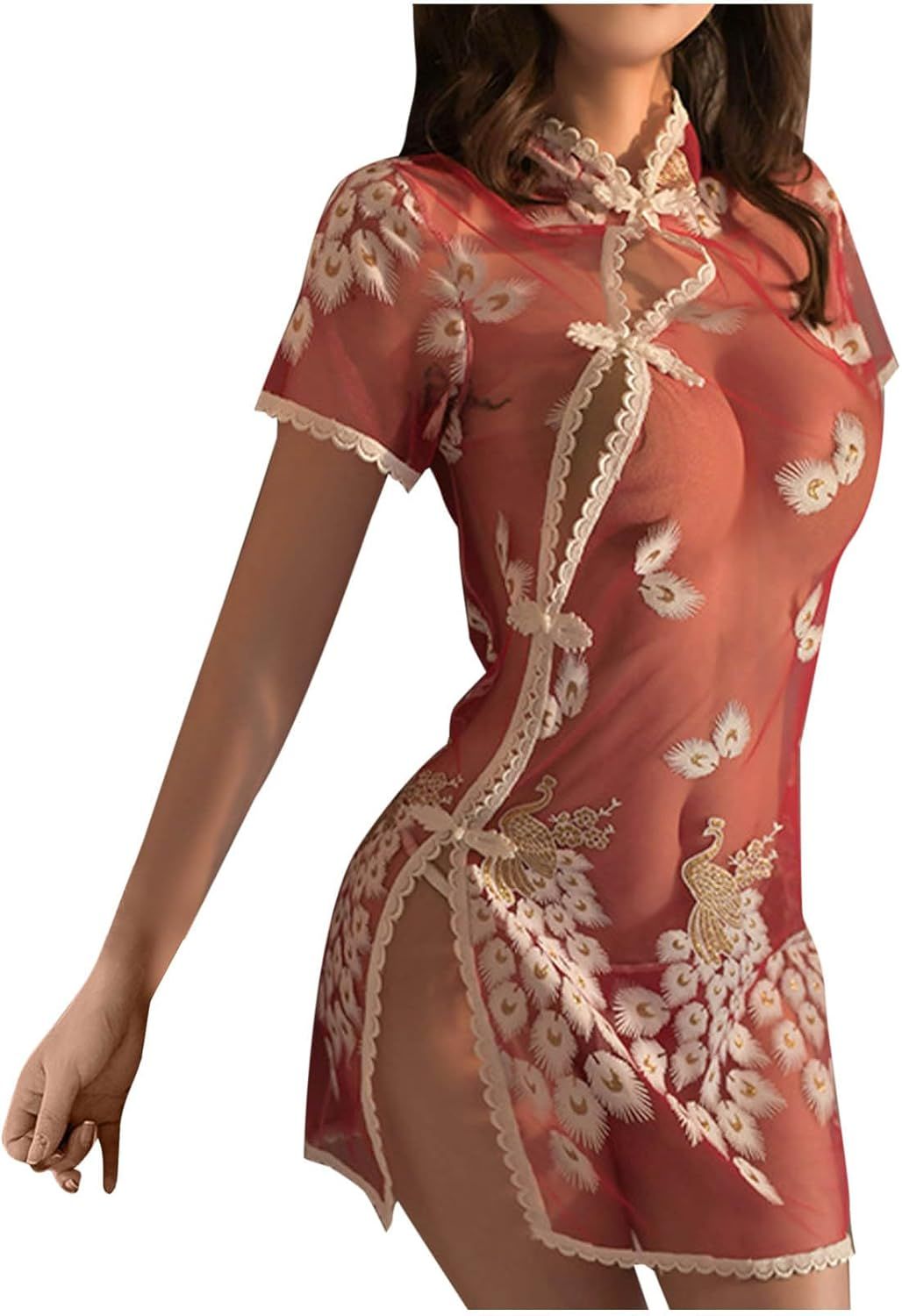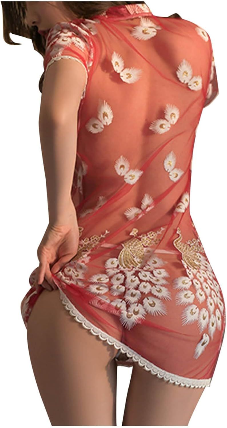 Mzkdieey Womens Sexy Mesh Cheongsam Lingerie Dress Perspective Chemise Sleepwear Set Chinese Style Qipao Erotic Clothes