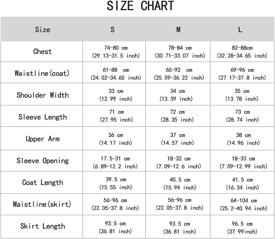 S: Chest -- 74-80cm (29.1-31.5in) , Shoulder Width -- 33cm (13.0in) , Sleeve Length -- 71cm (28.0in) , Tops Length -- 39.5cm (15.6in) , Waistline -- 56-96cm (22.0-37.8in) , Skirt Length -- 93.5cm (36.8in)