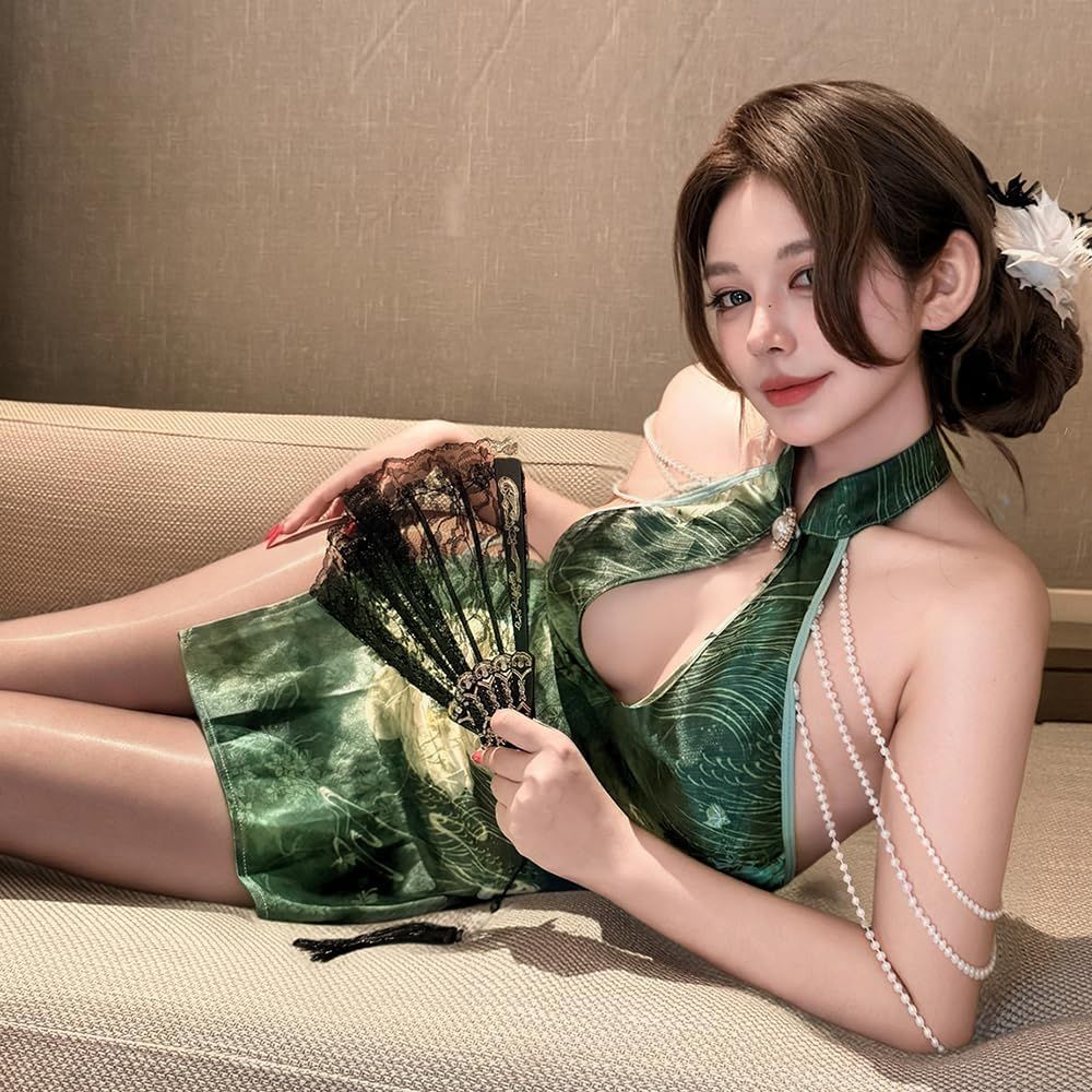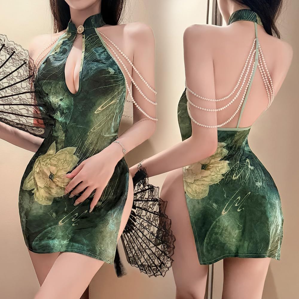 sexy cheongsam dress for women lingerie outfit Chinese Style Qipao Cosplay Costume flower pearl Anime Roleplay High Split Bodycon Chemise Nightgown Babydoll Thong Green