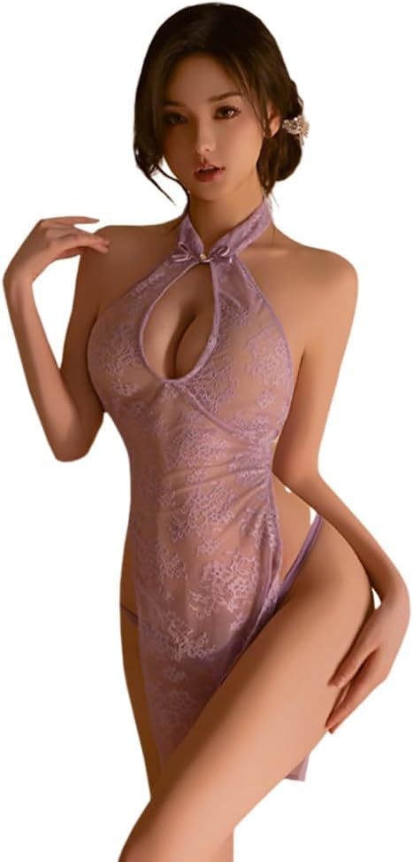 sexy cheongsam lingerie for women dress Chinese Qipao Cutout backless cosplay Costume outfit High Split Bodycon Sleepwear anime Roleplay Chemise Babydoll Thong Purple