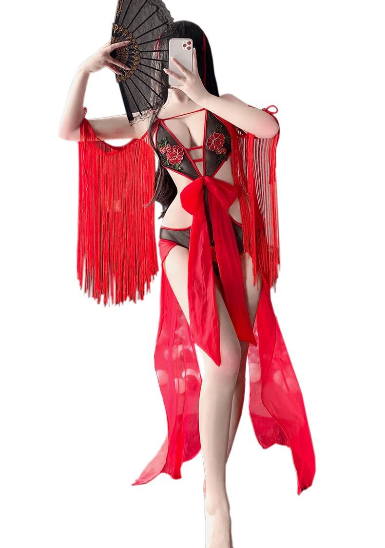 SINROYEE Women Through Sheer Mesh Outfits Jumpsuits Party Costume for Women Tassel Sexy Anime Lingerie Cosplay