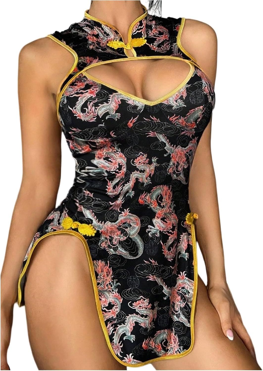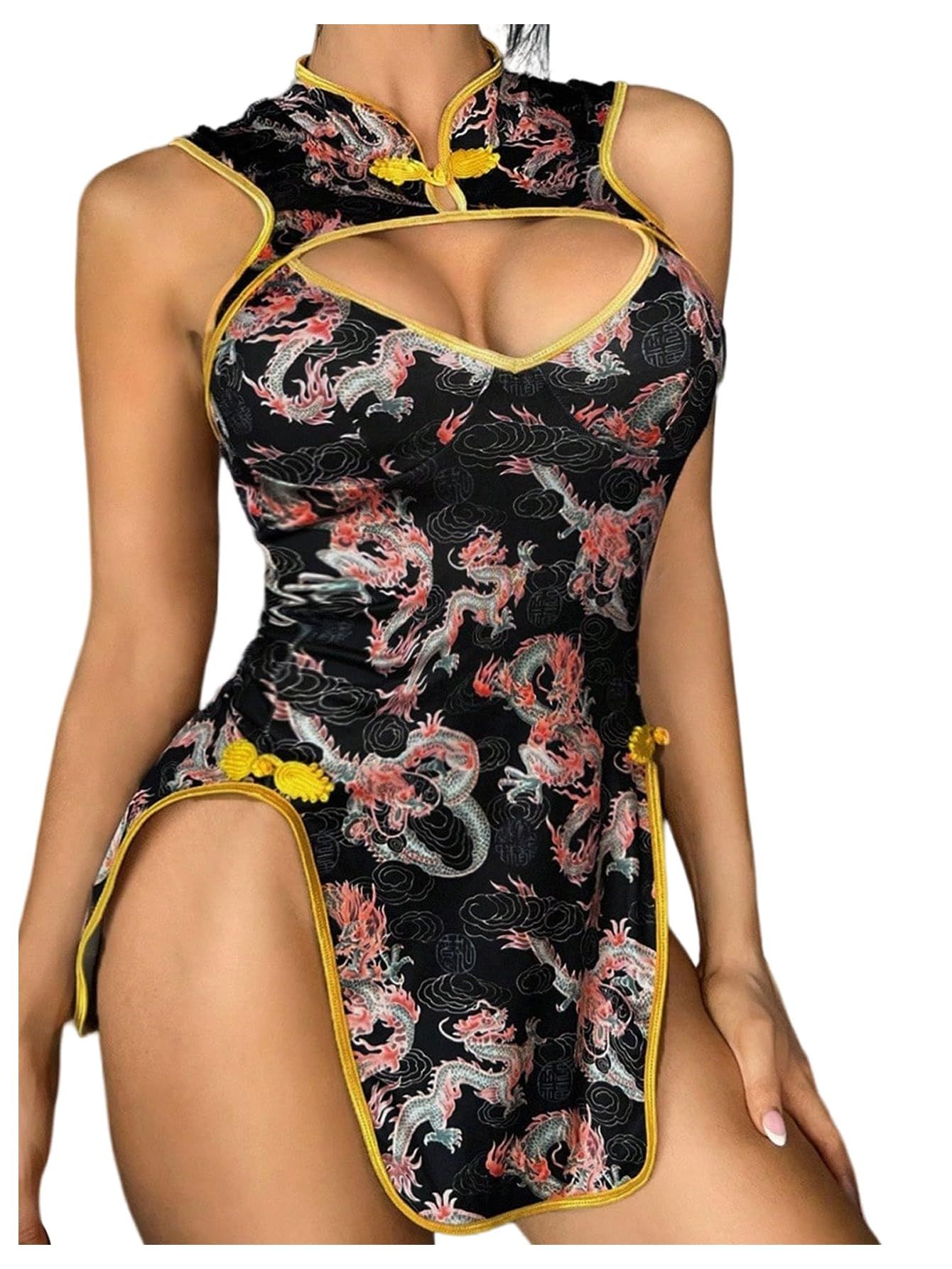 WDIRARA Women's Dragon Print Cut Out Cheongsam Lingerie Dress Slit Open Back Qipao Costume Outfits