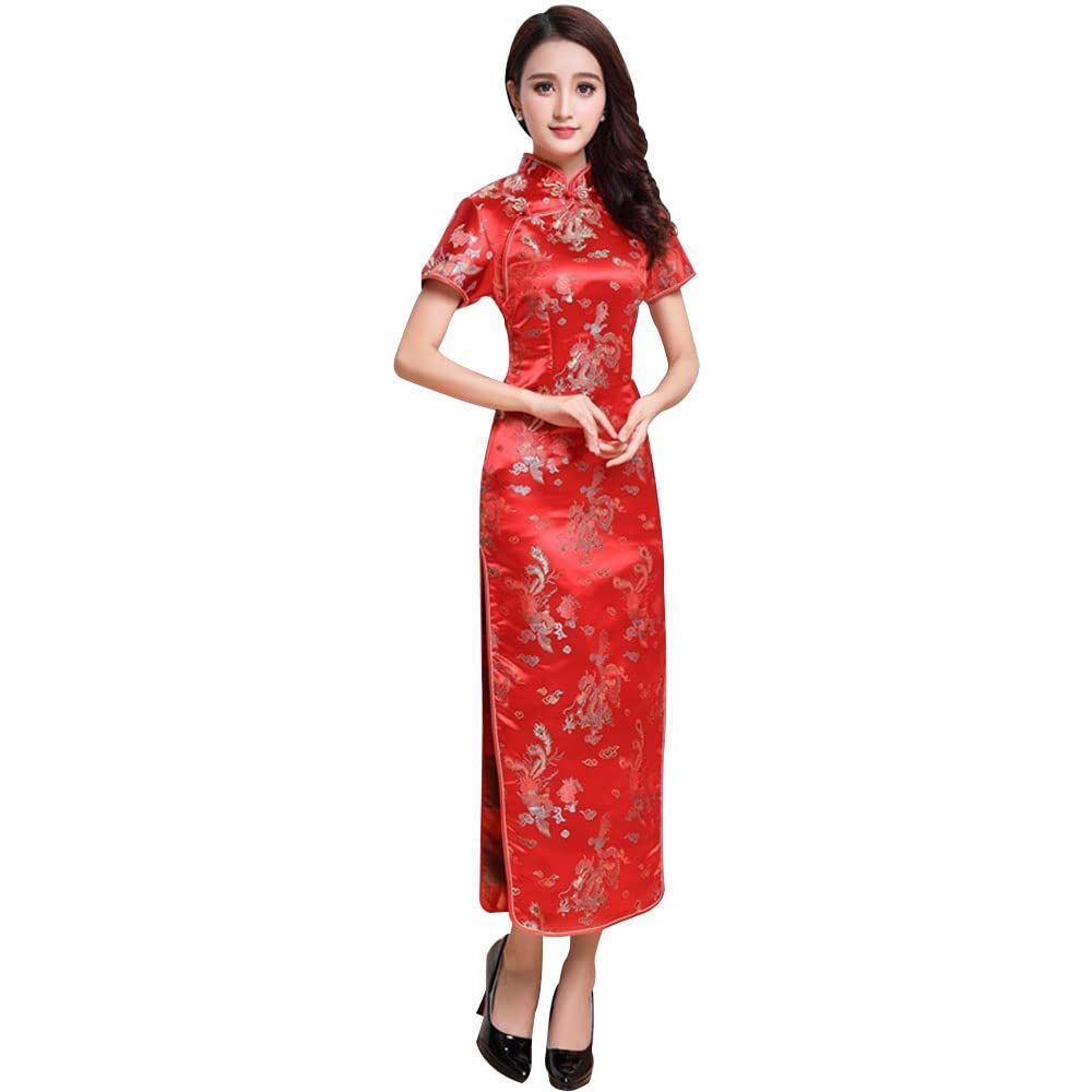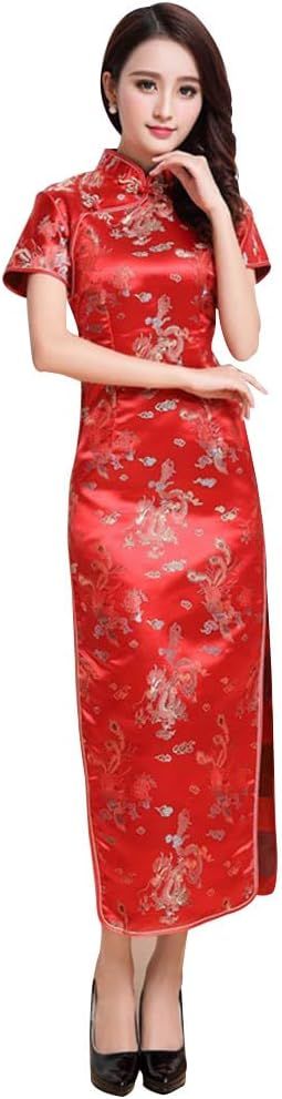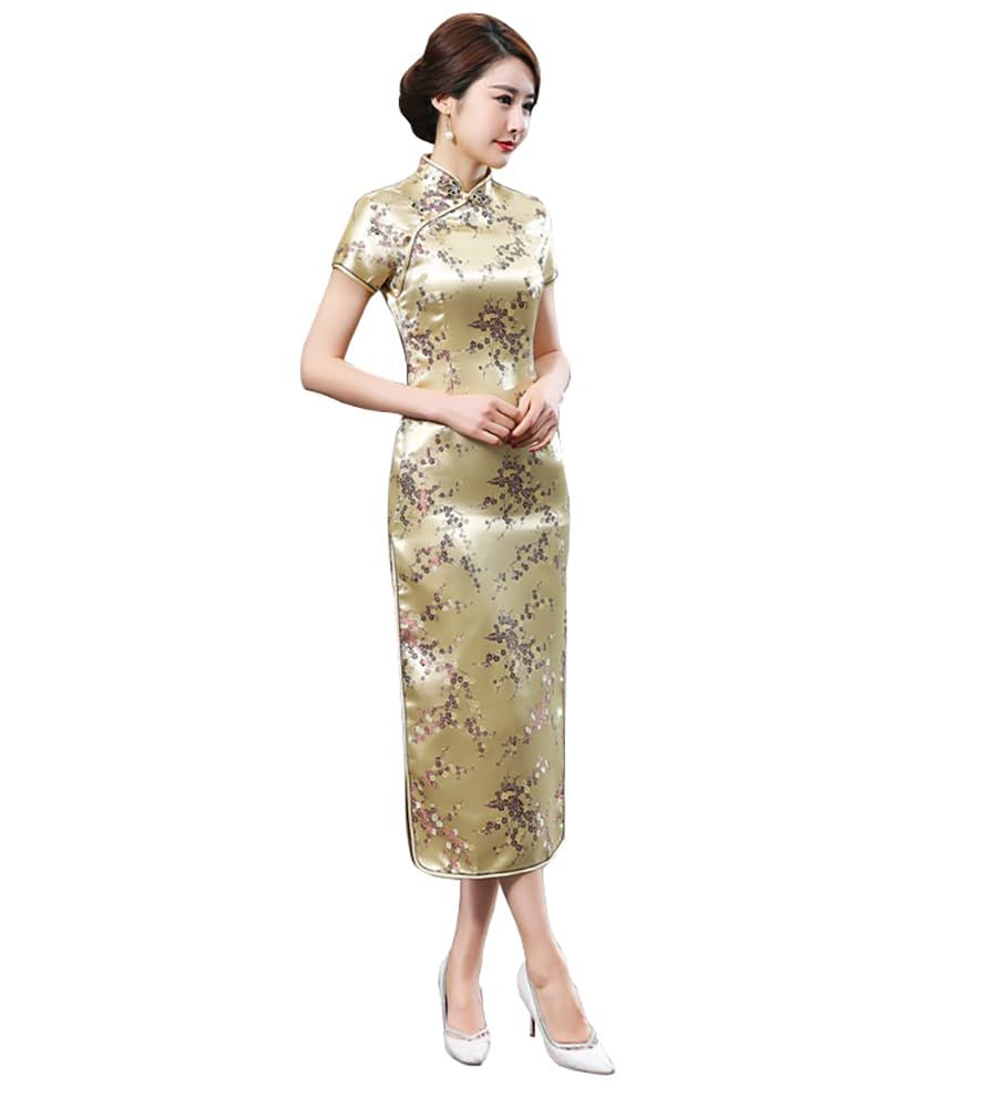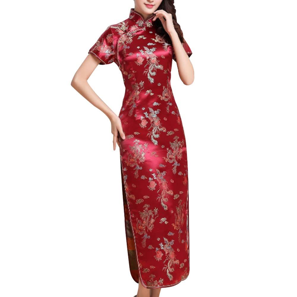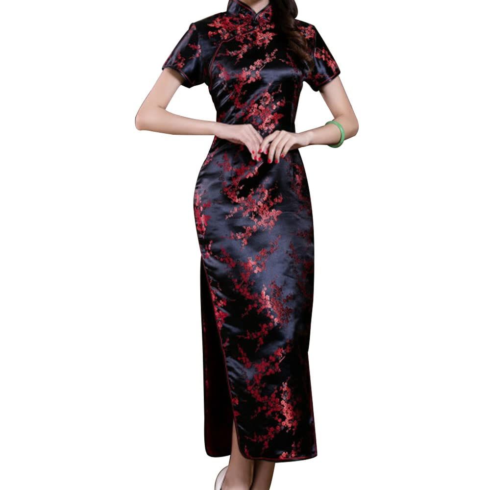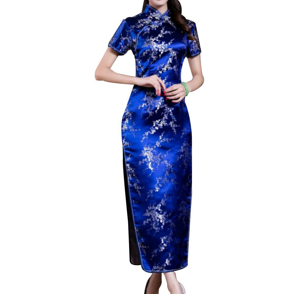 Women Cheongsam Long Dress Evening Short Sleeve Slim Fit Maxi Dress Floral Faux Silk Stand Collar Bodycon Qipao