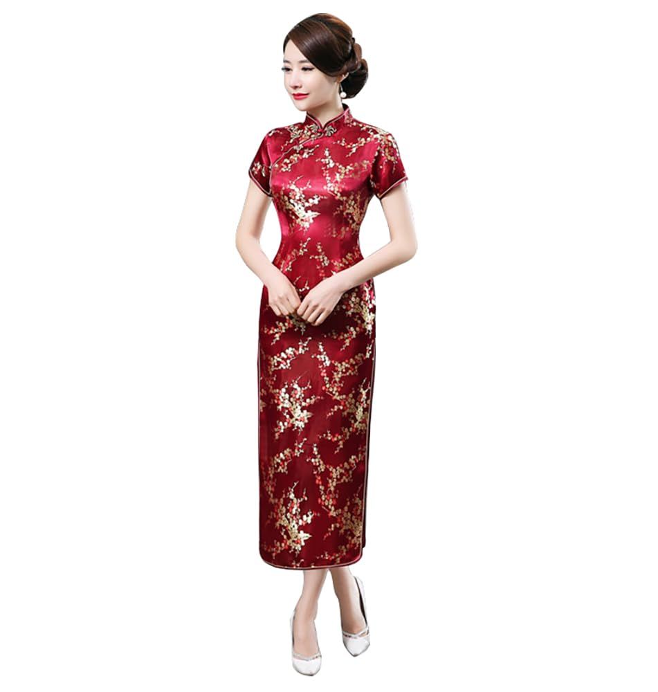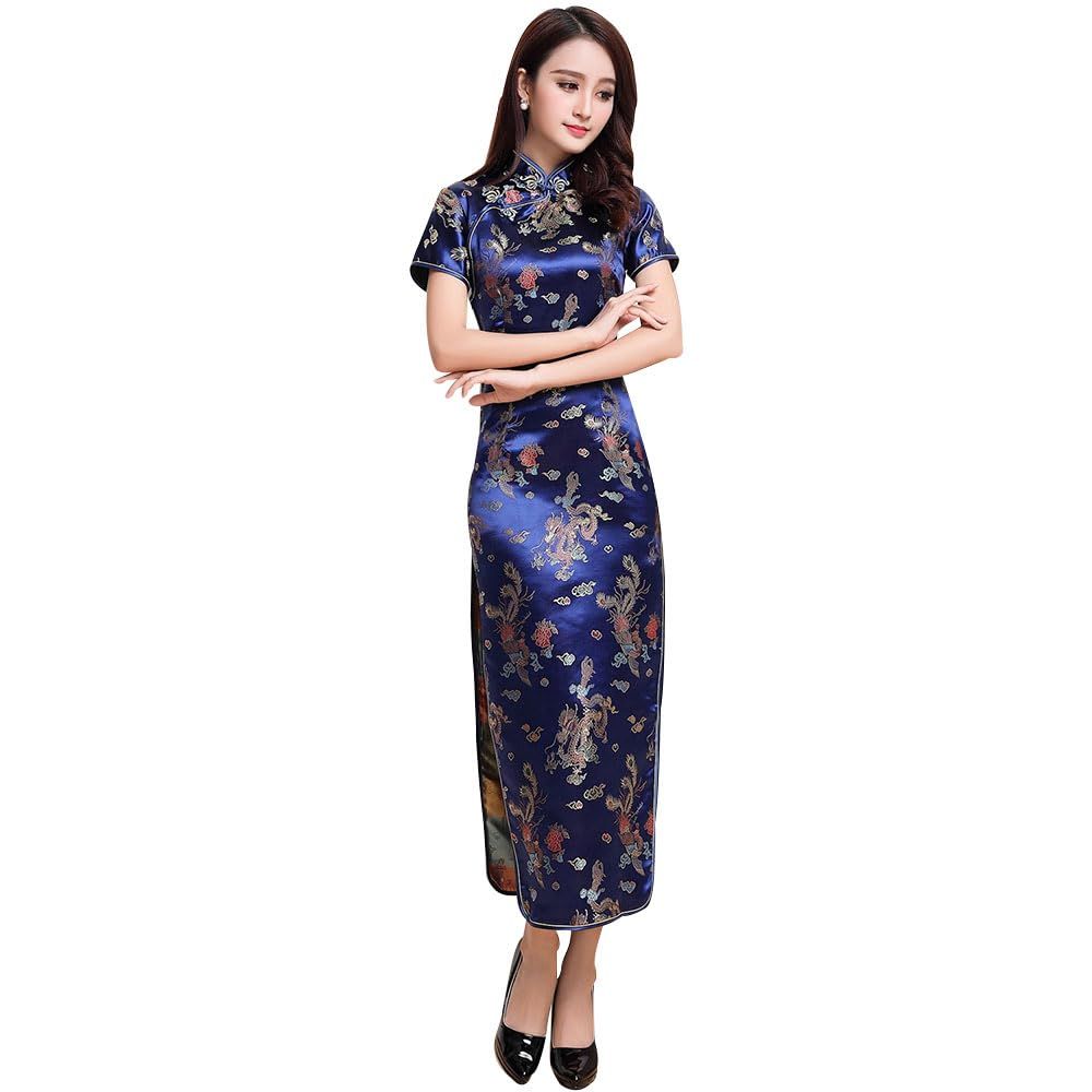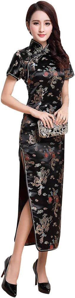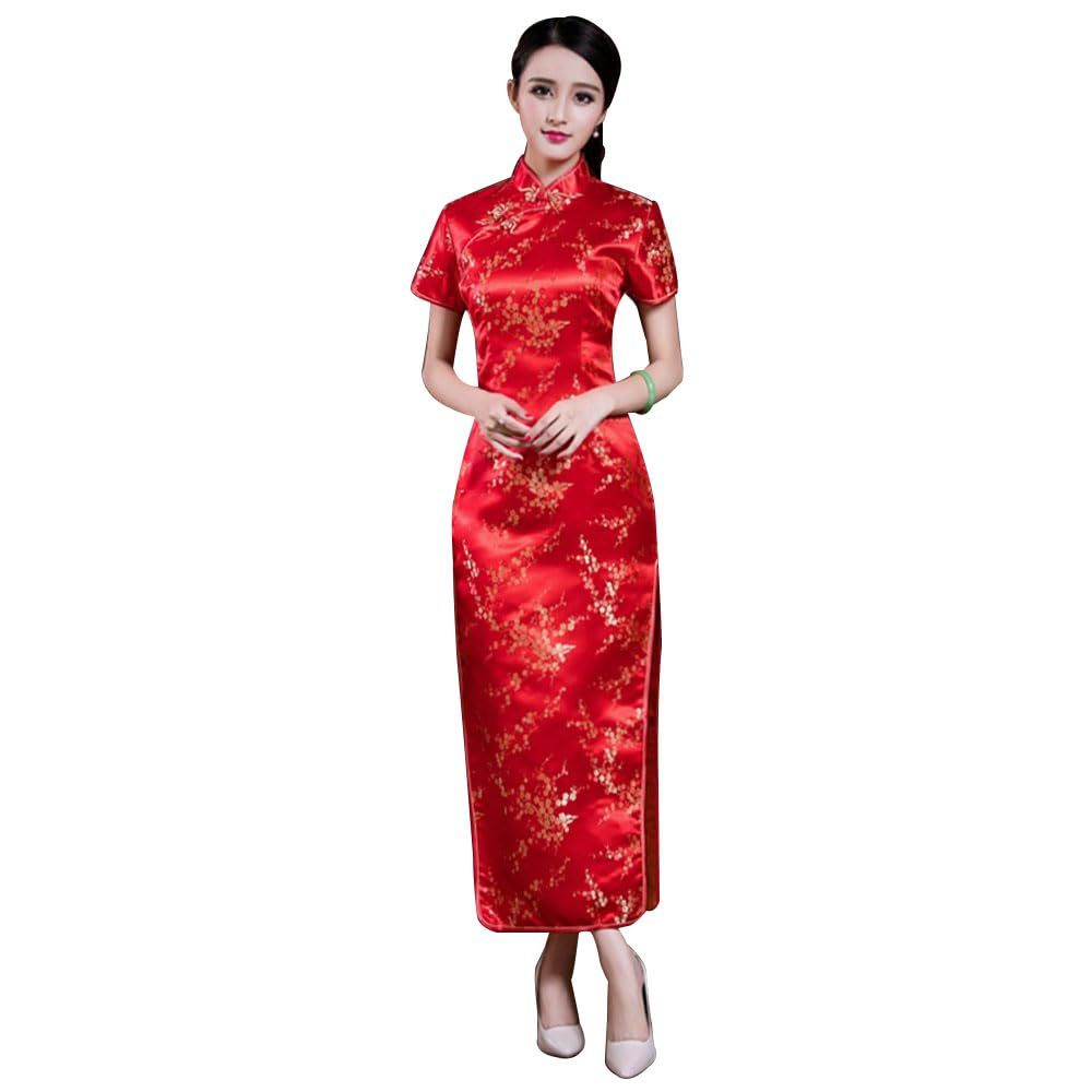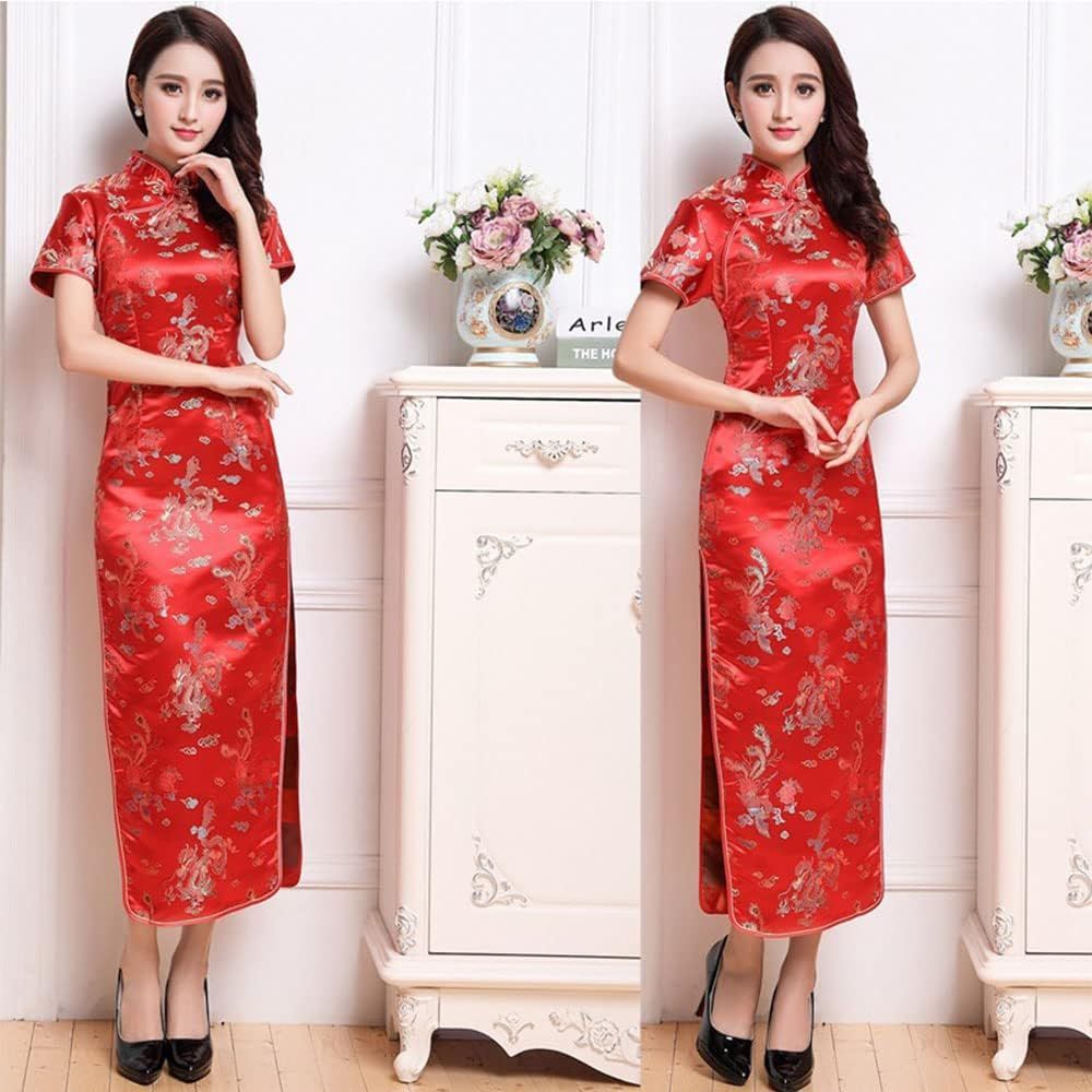 Women Cheongsam Long Dress Evening Short Sleeve Slim Fit Maxi Dress Floral Faux Silk Stand Collar Bodycon Qipao