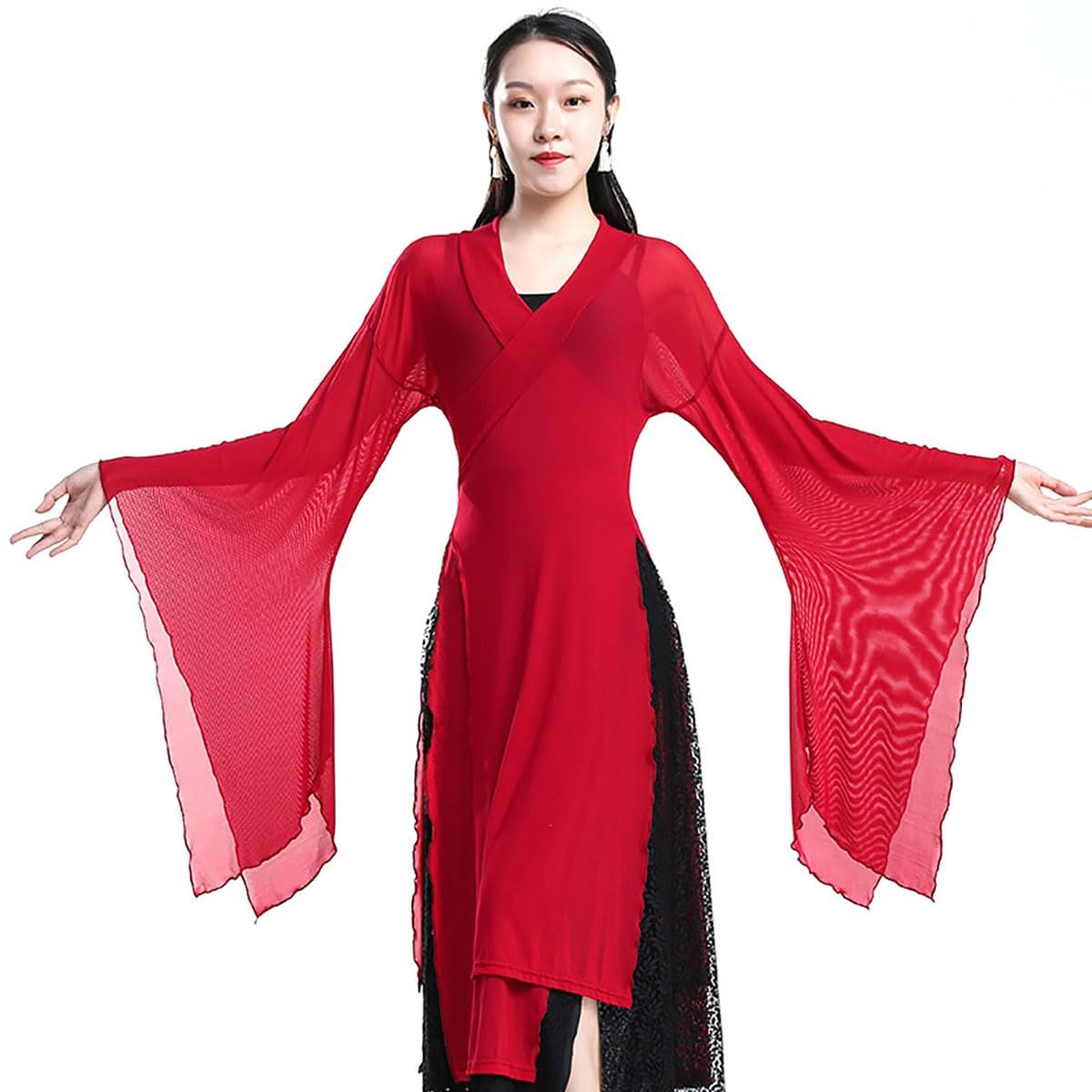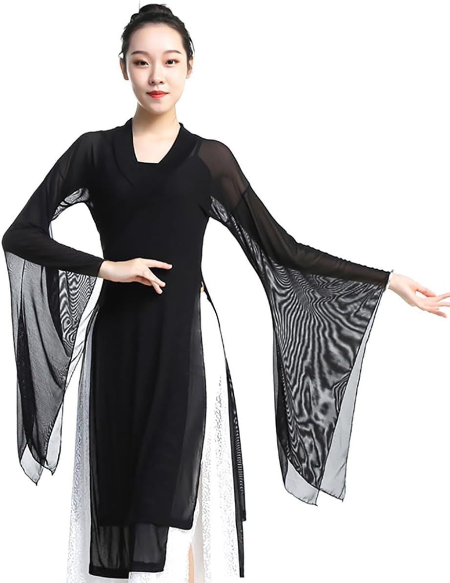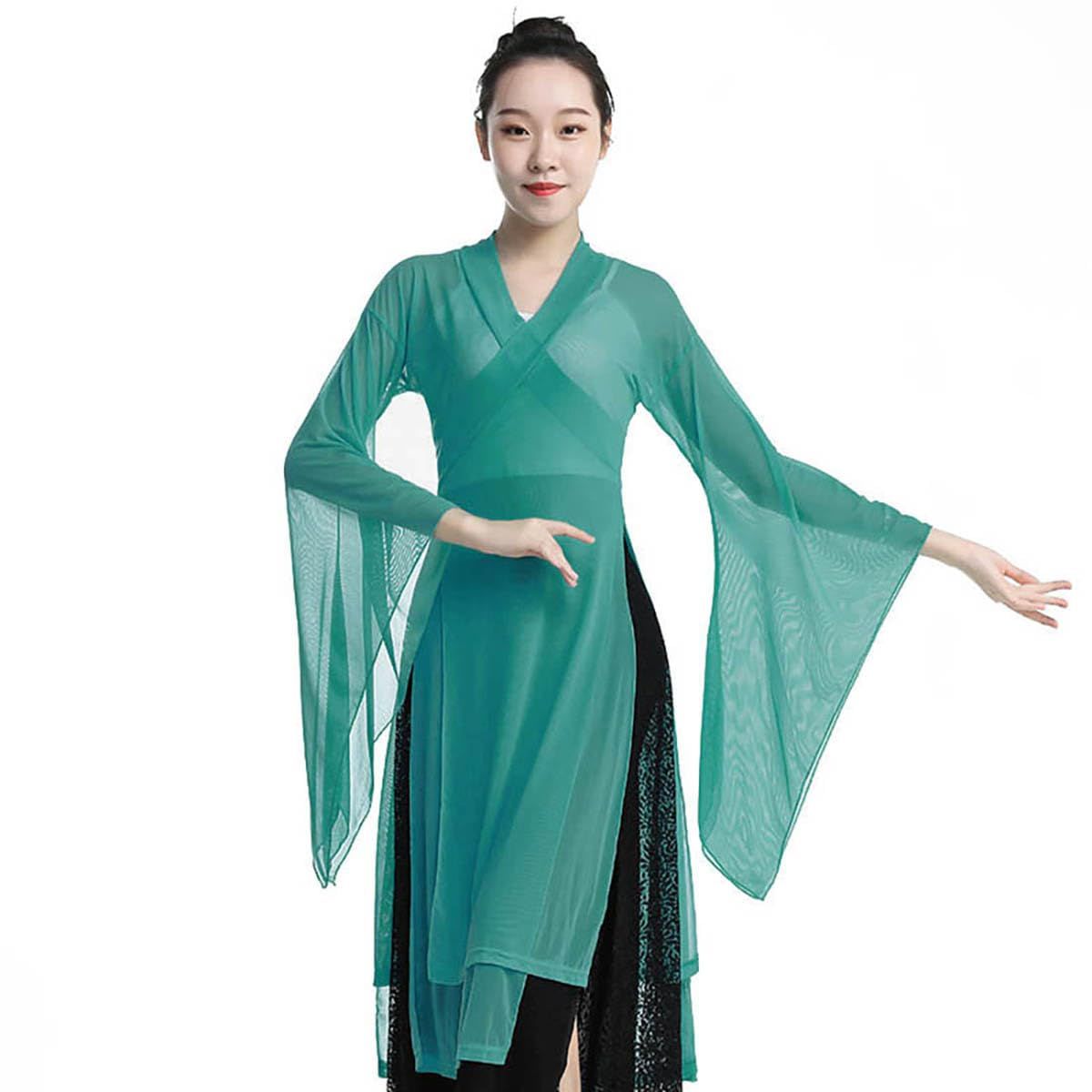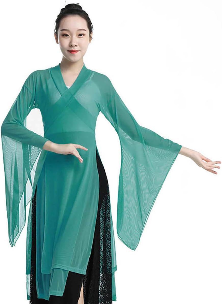 Women's Chinese Dance Tops Sheer Wide Sleeve Wrap Front Side Split Hanfu Top