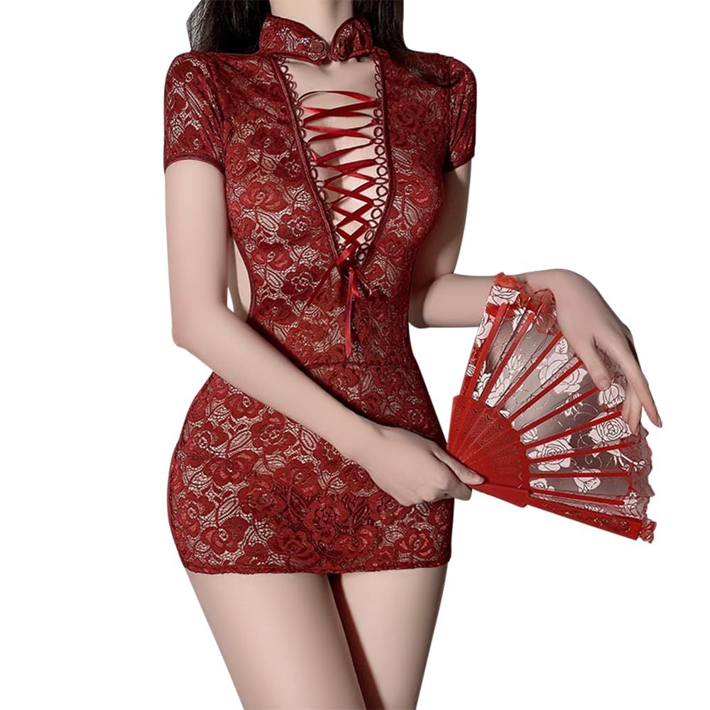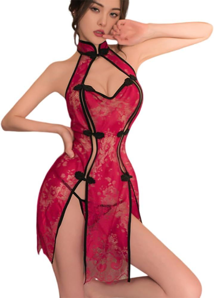 Women's cosplay lace high slit cheongsam lingerie party club outfit sexy hollow out perspective pajamas