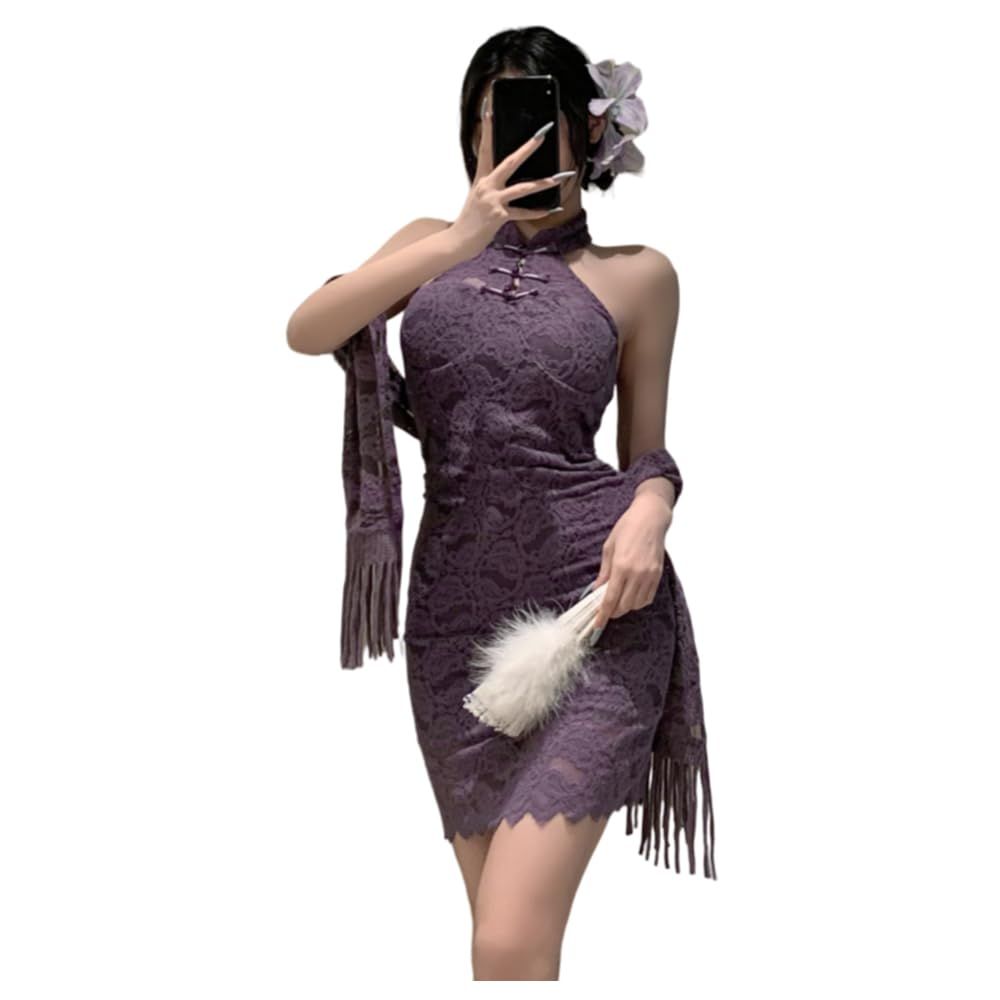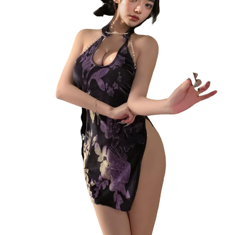 Women's cosplay retro V revealing sexy cheongsam underwear Chinese mesh slit dress