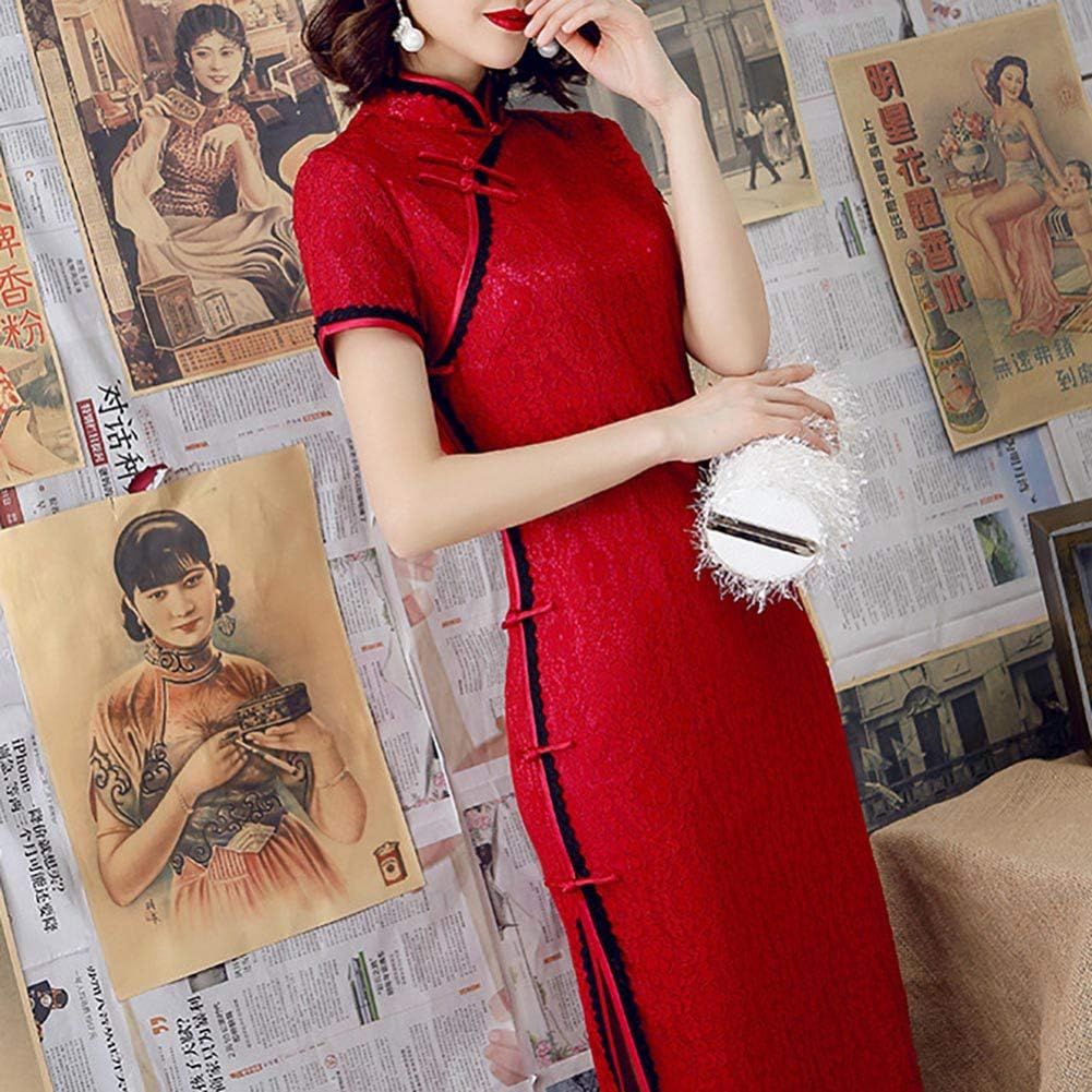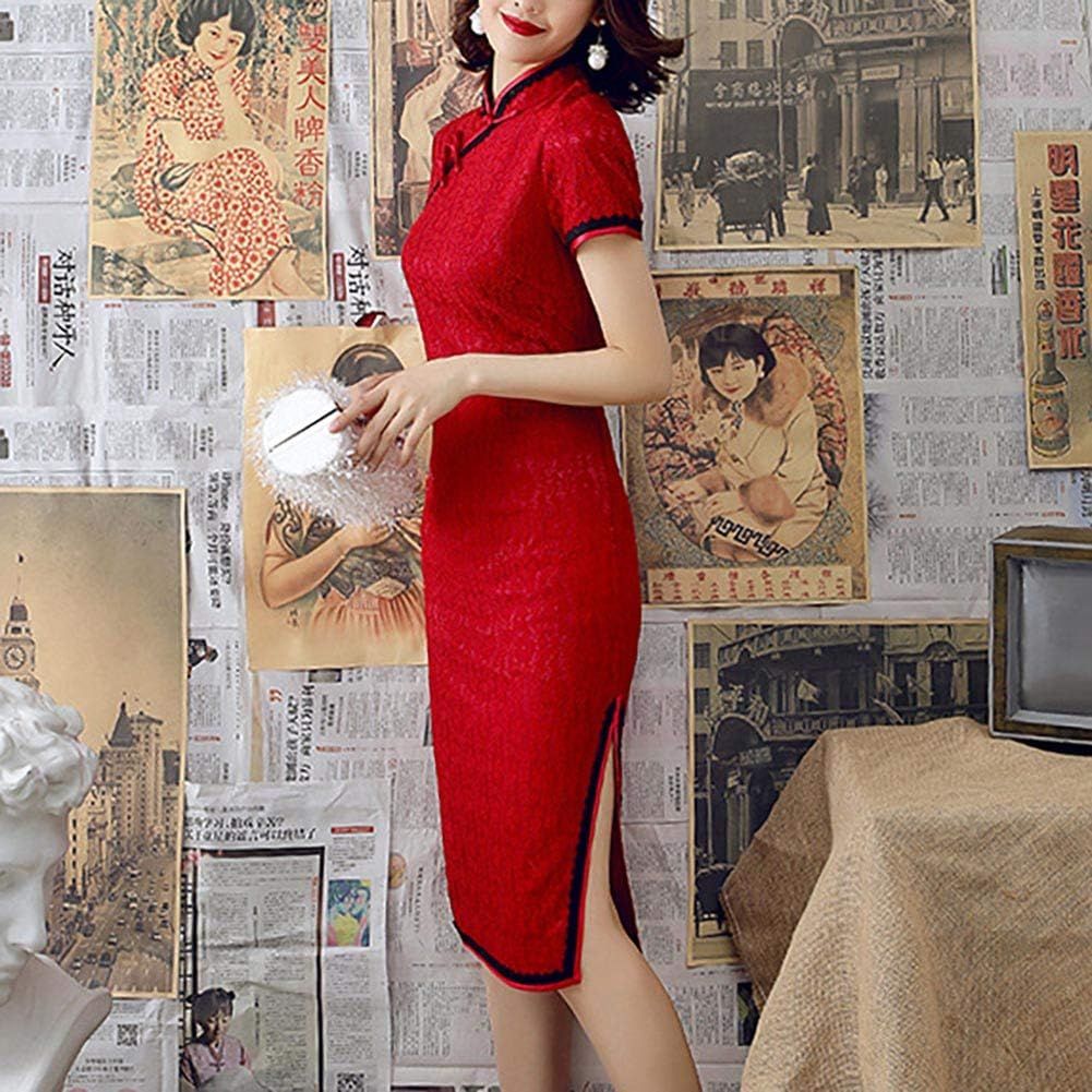 Women's Lace Floral Cheongsam Costume Vintage Embroidery Short Sleeve Side Slit Midi Dress Fashion Chinese Tradtional Qipao Gowns (102# Wine Red, L)
