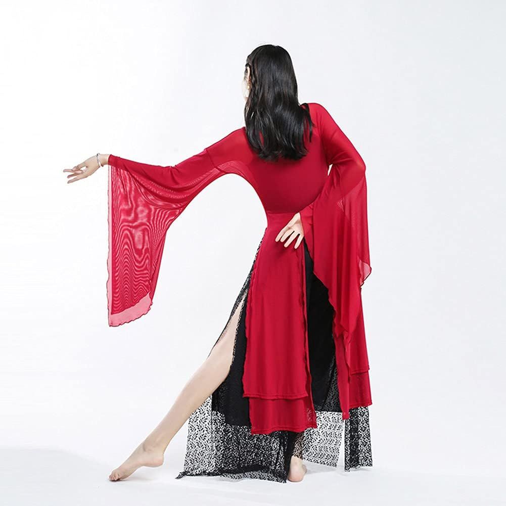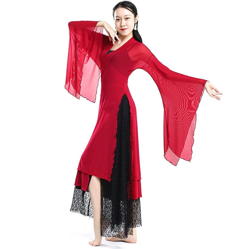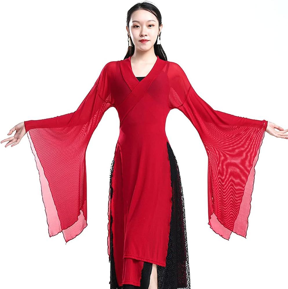 Women's Sheer Flowy Hanfu Top Flared Sleeve Wrap Front Side Split See Through Long Robe Chinese Classical Dance Wear