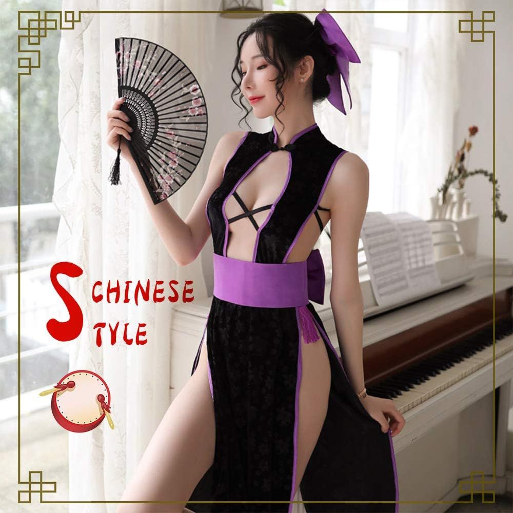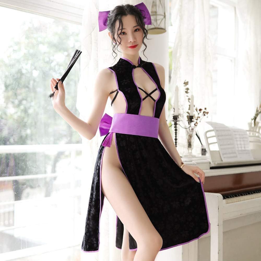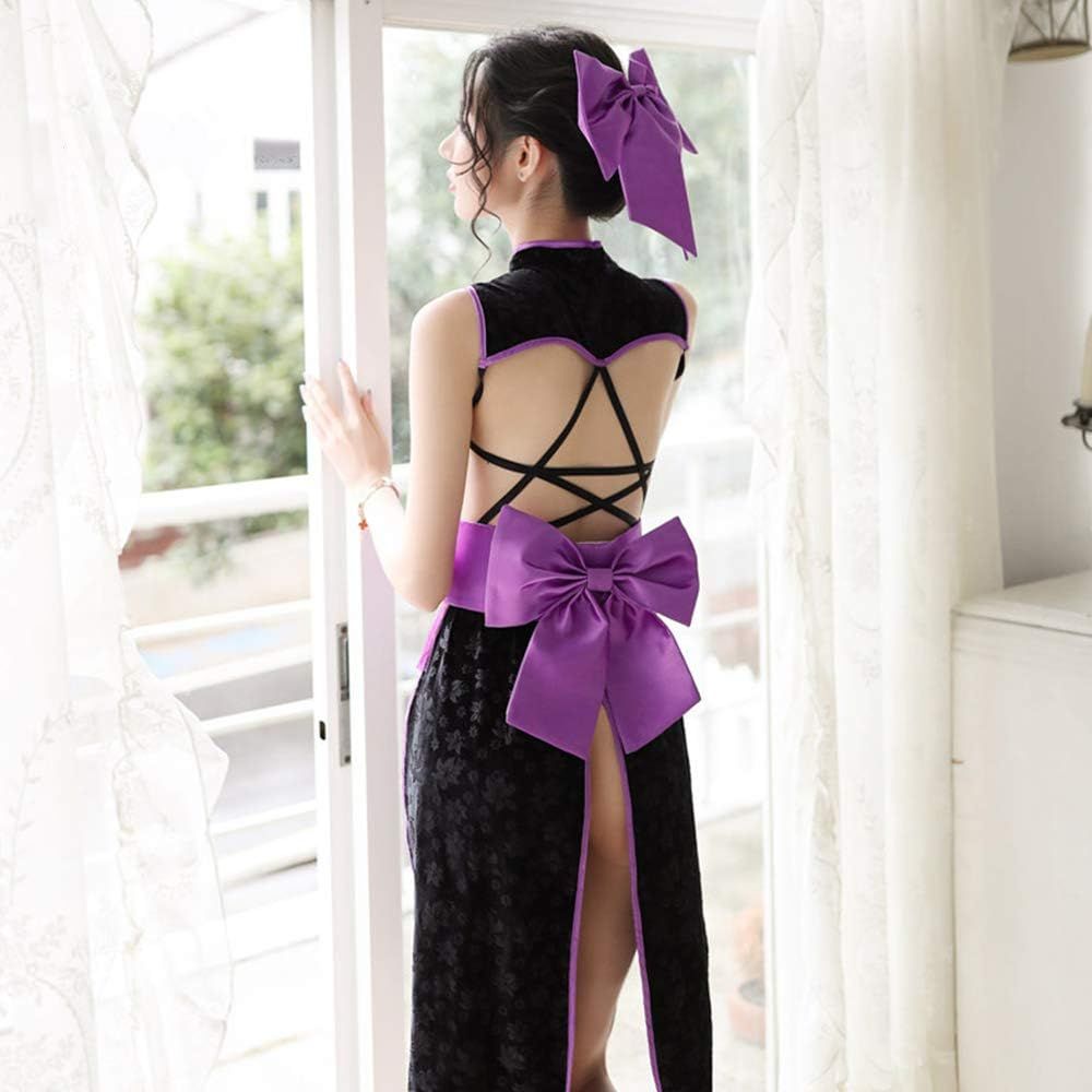 YOMORIO Sexy Cheongsam High Split Dress Cross Back Strappy Anime Cosplay Costume (Purple)